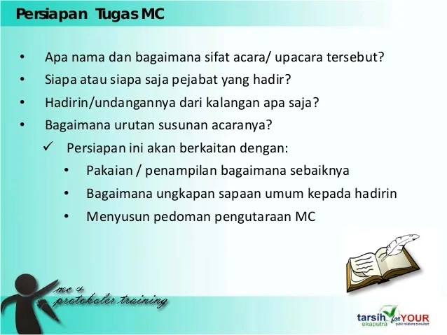 Contoh proposal event management adele organizer.pptx. "meski kami semua kangen dengan saudara saudara kmk ini kami tetap menekankan agar menjaga jarak, dan tidak berjabat tangan prioritas menjaga protokol kesehatan," Hari jadi dgci laskar mojopahit yang ke 5 tahun ini nampak lebih meriah dari tahun tahun sebelumnya. Pembawa acara ( mc ) adalah orang yang menyampaikan susunan acara kepada peserta atau hadirin yang mengikuti acara tersebut. Banyak orang merasa sulit untuk menjadi pembawa acara, namun ternyata itu salah, dan karena masalahnya anda tidak memiliki pengalaman dalam memimpin suatu acara. susunan acara yang nantinya akan diselenggarakan di grand savero hotel yaitu, berbagi edukasi sawer penganten adat sunda bersama narasumber kang owon, teh ussi. acara dimulai dengan pembacaan sholawat nabi dari para santri, kemudian diikuti para peserta termasuk 4 komunitas. Pada sidang tahunan ini, presiden joko widodo atau jokowi dijadwalkan akan menyampaikan dua pidato kenegaraan. Sebenarnya tidak ada anjuran untuk mengadakan hari ulang tahun, tapi sesekali kita bisa melaksanaknnya untuk anak kita. Yang akan kami sajikan kehadapan bapak, ibu sekalian. Rizki febryan ( mimin ) seksi transportasi : Pertama adalah pidato presiden ri dalam rangka sidang tahunan mpr ri dan sidang bersama dpr. Kemudian acara dilanjutkan dengan sambutan dari ketua pelaksana baksos, dari bmc chapter malang, pihak rw wonokoyo dan pengurus.